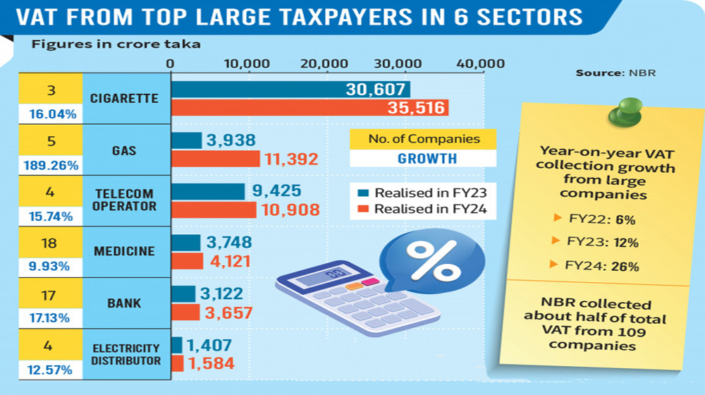 বৃহৎ প্রতিষ্ঠানের কাছ থেকে ভ্যাট সংগ্রহের সামগ্রিকভাবে উল্লেখযোগ্য প্রবৃদ্ধি সত্ত্বেও এনবিআরের তথ্য থেকে দেখা গেছে, ২৮টি কোম্পানির সমন্বয়ে গঠিত অন্তত ১০টি খাতে ব্যবসা বাড়েনি। এতে এসব খাত থেকে ভ্যাট সংগ্রহ প্রভাবিত হয়েছে।