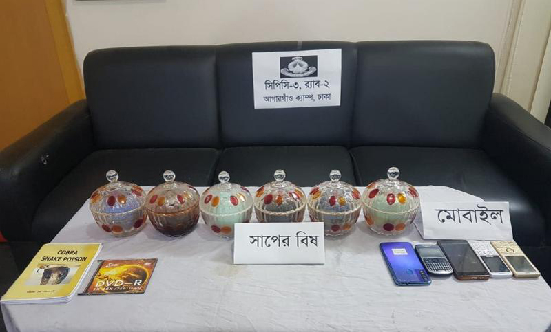 এতে বলা হয়, আন্তর্জাতিক চোরাচালান চক্রের কয়েকজন সদস্য পাচারের উদ্দেশ্যে বিপুল পরিমাণ সাপের বিষ নিয়ে দক্ষিণখানের গুলবার মুন্সি সরণি এলাকায় অবস্থান করছেন বলে বৃহস্পতিবার বিকালে খবর পায় র্যাব-২। পরে সেখানে অভিযান চালালে র্যাবের উপস্থিতি টের পেয়ে দৌঁড়ে পালানোর চেষ্টাকালে চক্রের ছয় সদস্যকে আটক করা হয়।