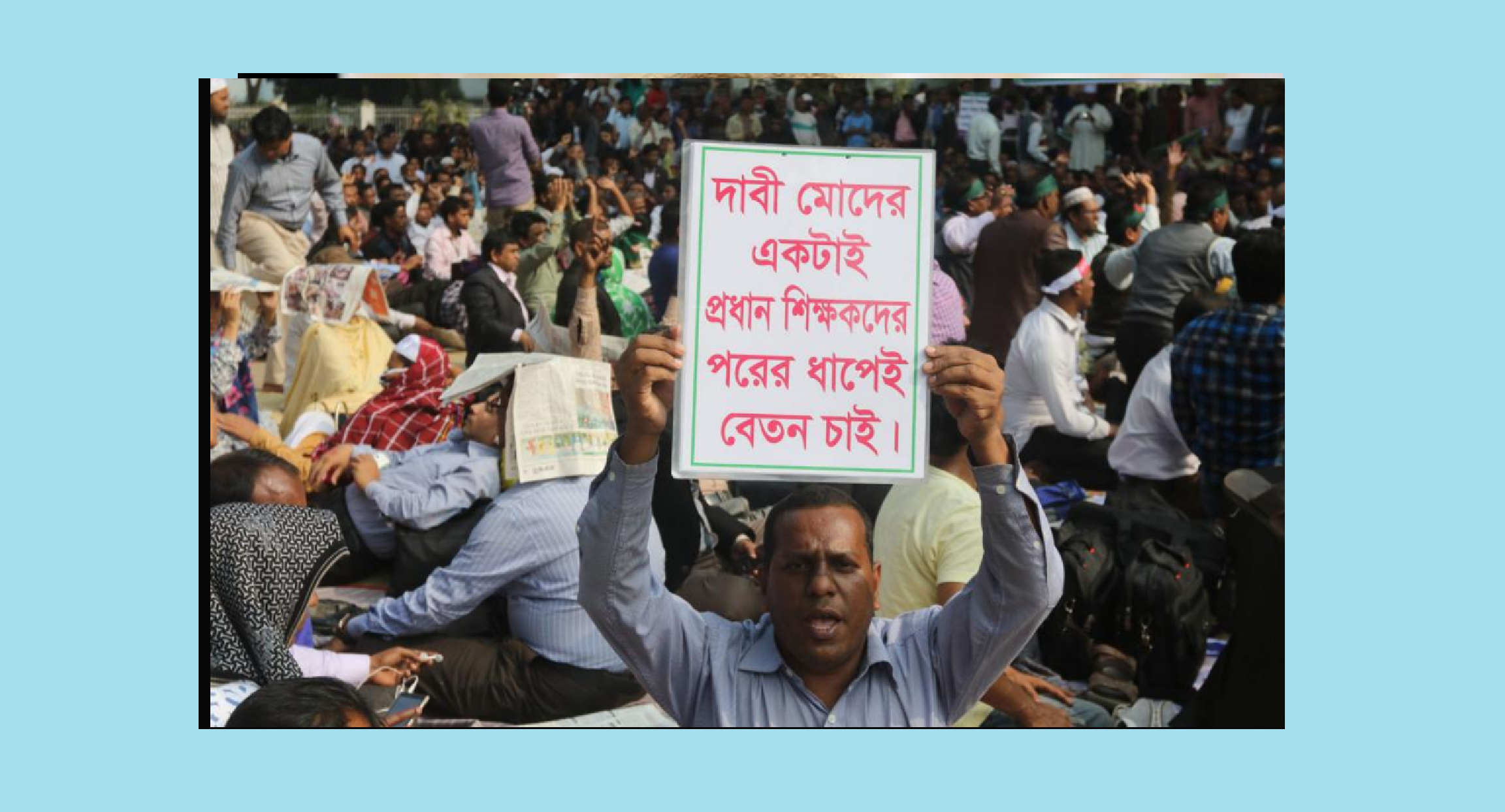 প্রধান শিক্ষকদের এক ধাপ নিচে জাতীয় বেতন স্কেলের ১১তম গ্রেডে বেতনের দাবিতে জাতীয় শহীদ মিনারে আমরণ অনশন কর্মসূচি দ্বিতীয় দিনের মতো আজও চলছে।