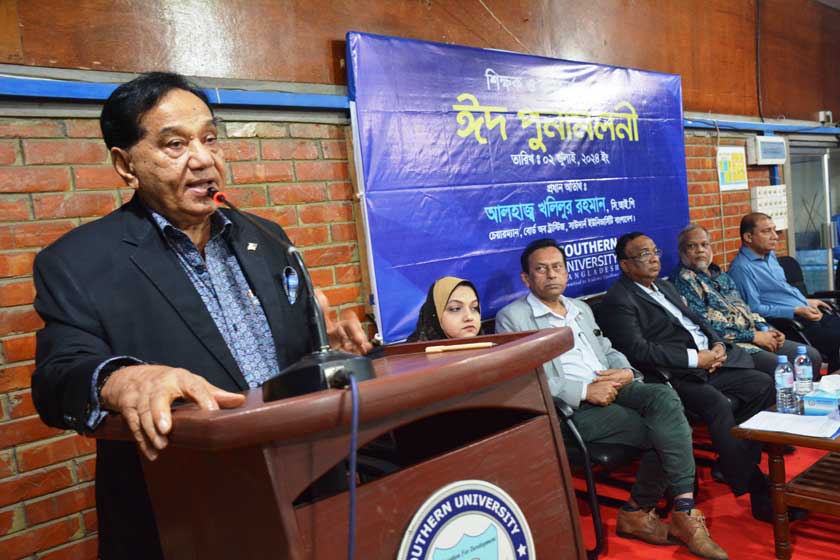 সাউদার্ন ইউনিভার্সিটিতে গল্প, আড্ডা, গান, আনন্দ উৎসব সহ নানা আয়োজনে অনুষ্ঠিত হলো ঈদ পুনর্মিলনী অনুষ্ঠান। গতকাল মঙ্গলবার বিকেলে উপাচার্য(ভারপ্রাপ্ত) ড. শরীফ আশরাফউজ্জামানের সভাপতিত্বে আয়োজিত এ উৎসবে প্রধান অতিথি ছিলেন সাউদার্ন ইউনিভার্সিটি ট্রাস্টি বোর্ডের চেয়ারম্যান বিশিষ্ট শিল্পপতি ও শিক্ষানুরাগী খলিলুর রহমান সি.আই.পি। বিশেষ অতিথি হিসেবে উপস্থিত ছিলেন ট্রাস্টি বোর্ডের সদস্য আবদুস সালাম মীর, উদ্যোক্তা ও ট্রাস্ট সেক্রেটারি অধ্যাপক সরওয়ার জাহান, ট্রাস্টি বোর্ডের সদস্য ফেরদৌস খান আলমগীর, প্রফেসর ড. ইসরাত জাহান। আরও উপস্থিত ছিলেন বিশ্ববিদ্যালয়ের শিক্ষক, কর্মকর্তা ও কর্মচারীবৃন্দ।