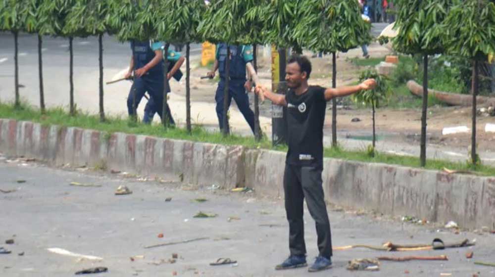 মামলার এজাহারে উল্লেখ করা হয়, বেলা ২টা ১৫ মিনিটের দিকে ছাত্র নামধারী সুবিধাভোগী রাষ্ট্রবিরোধী আন্দোলনরত দুর্বৃত্তগণ বিভিন্ন দিক থেকে বৃষ্টির মতো ইট-পাটকেল ও তাদের নিকটে থাকা আগ্নেয়াস্ত্র হতে এলোপাতাড়ি গুলি করে। পরিস্থিতি নিয়ন্ত্রণে আনার লক্ষ্যে তাদের ছত্রভঙ্গ করতে পুলিশও এপিসি গাড়ির মধ্য হতে কং/১১৮৬ সোহেল তার নামীয় সরকারি ইস্যুকৃত শটগান হইতে ১৬৯ রাউন্ড রাবার বুলেট ফায়ার করে। পুরো বিশ্ববিদ্যালয় এলাকা রণক্ষেত্রে পরিণত হয়।