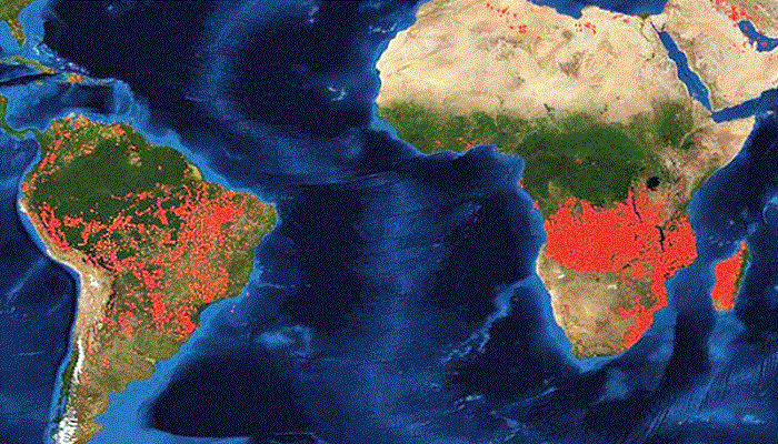 আগুনের লেলিহান শিখা গ্রাস করে নিচ্ছে ‘পৃথিবীর ফুসফুস’ বলে খ্যাত আমাজন বনাঞ্চলকে। এই রেইন ফরেস্টকে বাঁচাতে গোটা বিশ্ব যখন একজোট হচ্ছে ঠিক তখনই জানা গেল, আগুনে পুড়ে ছাই হচ্ছে পৃথিবীর দ্বিতীয় ফুসফুস হিসেবে পরিচিত আফ্রিকার দক্ষিণ অংশের বনাঞ্চল। নাসার উপগ্রহ চিত্রে দেখা গেছে, আফ্রিকার দক্ষিণ অংশের কঙ্গো অববাহিকায় ১০ লাখ বর্গমাইলেরও বেশি এলাকা গ্রাস করে নিচ্ছে দাবানল।