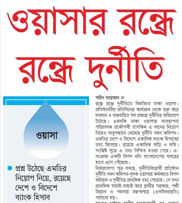 বাংলাদেশের খবরে প্রকাশিত ‘ওয়াসার রন্ধ্রে রন্ধ্রে দুর্নীতি’ শীর্ষক প্রতিবেদনের প্রতিবাদ জানিয়েছে ঢাকা পানি সরবরাহ ও পয়ঃনিষ্কাশন কর্তৃপক্ষ (ঢাকা ওয়াসা)। গত সোমবার বাংলাদেশের খরবের প্রথম পাতায় প্রধান সংবাদ হিসেবে অনুসন্ধানী প্রতিবেদনটি প্রকাশিত হয়।