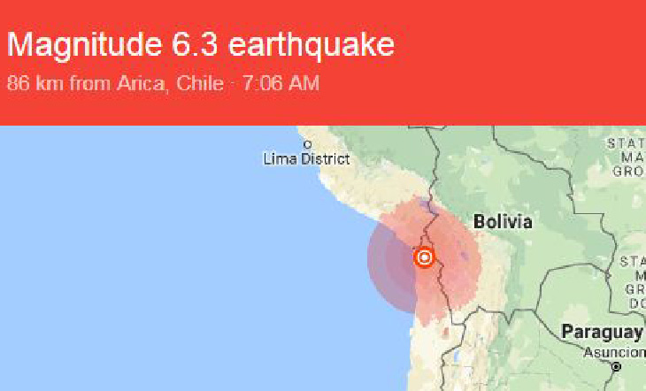 চিলিতে ৬ দশমিক ৩ মাত্রার একটি ভূমিকম্প হয়েছে। রবিবার পুত্রে থেকে ৭৬ কিলোমিটার দক্ষিণে এটি আঘাত হানে। মার্কিন ভূতাত্ত্বিক জরিপ সংস্থা এ কথা জানিয়েছে। খবর সিনহুয়ার।