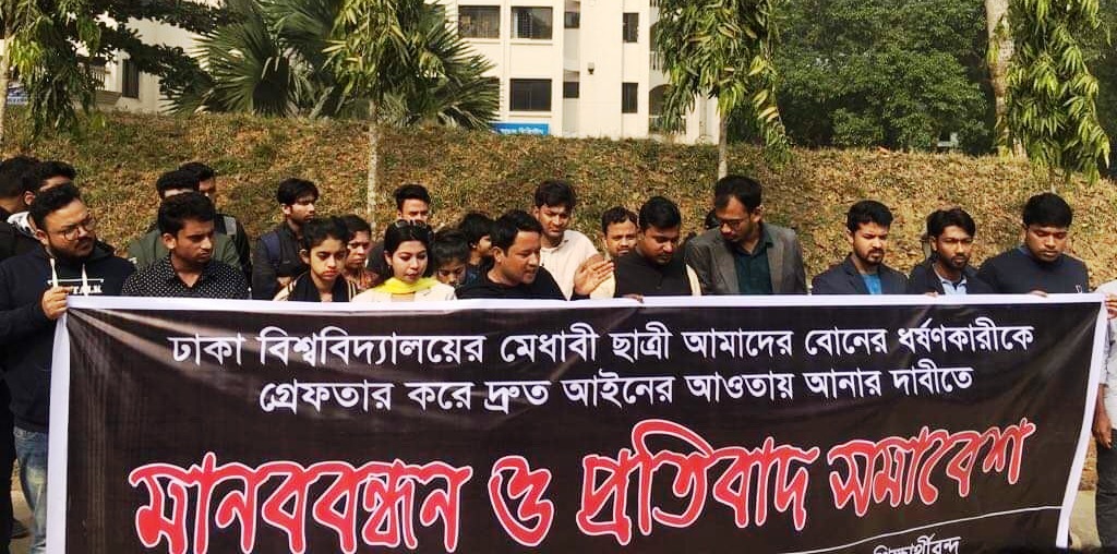 আজ মঙ্গলবার বেলা ১২টার দিকে বিশ্ববিদ্যালয়ের মূল ফটকের সামনে এ মানববন্ধনের আয়োজন করা হয়। এ সময় সাধারণ শিক্ষার্থীবৃন্দ রাজধানীর কুর্মিটোলায় ঢাবি শিক্ষার্থীর ধর্ষক কে আইনের আওতায় এনে সর্বোচ্চ শাস্তির দাবি নিশ্চিত করতে আহ্বান জানান।