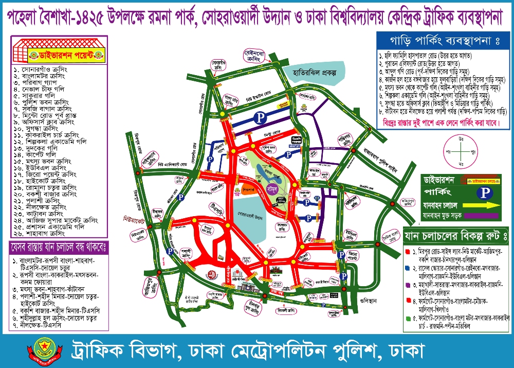 বাংলা নববর্ষ বরণ উপলক্ষে আগামী ১লা বৈশাখ ১৪২৫ (১৪ এপ্রিল ২০১৮ খ্রি.) রমনা বটমূল, সোহরাওয়ার্দী উদ্যান, শিশু পার্ক, চারুকলা ইন্সটিটিউট, ঢাকা বিশ্ববিদ্যালয়, বাংলা একাডেমী, দোয়েল চত্বর, শিশু একাডেমী, হাইকোর্ট ও তৎসংলগ্ন এলাকায় প্রচুর জনসমাগম হবে। উক্ত এলাকায় সুষ্ঠু যানবাহন চলাচলের লক্ষ্যে ঢাকা মেট্রোপলিটন পুলিশ এর পক্ষ থেকে বিশেষ ট্রাফিক ব্যবস্থা গ্রহণ করা হয়েছে।