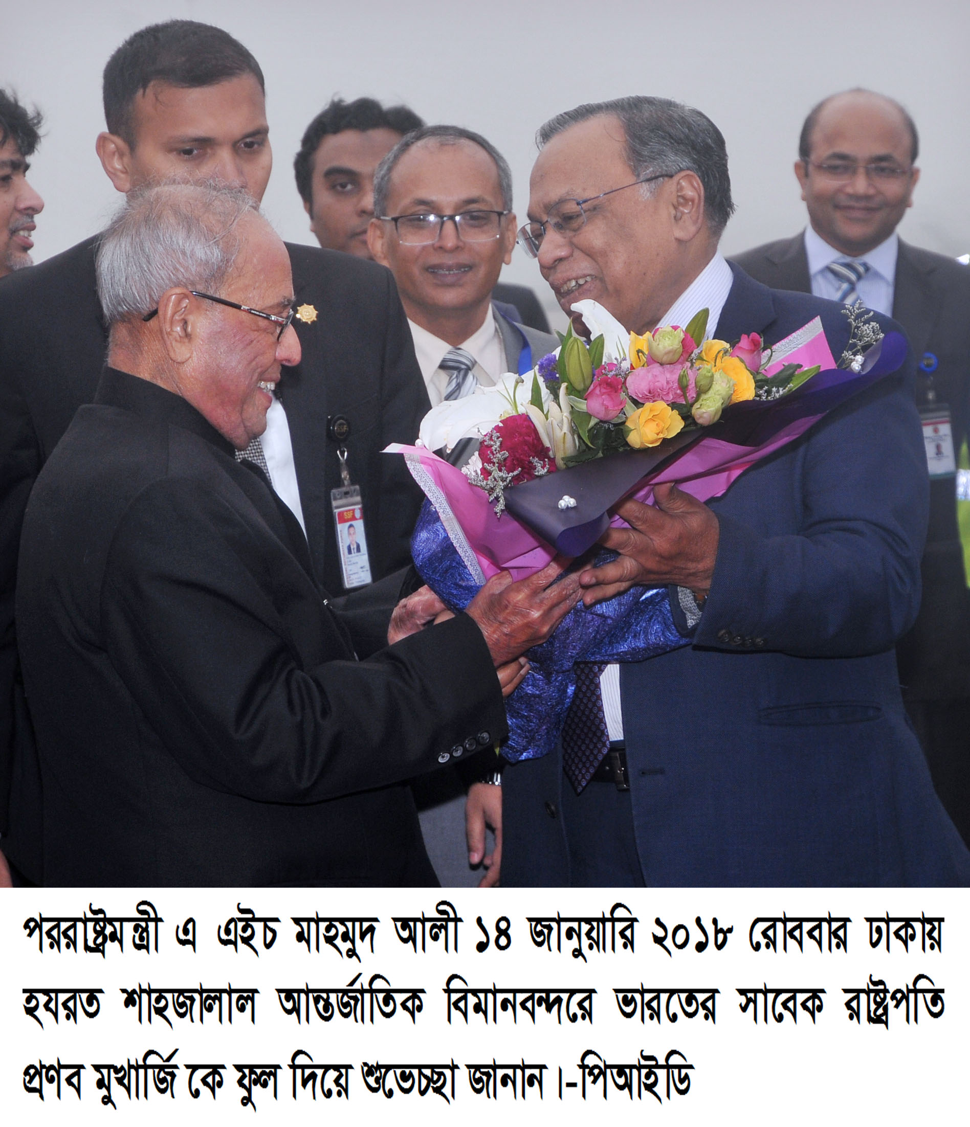 বিমানবন্দরে প্রণব মুখার্জিকে স্বাগত জানান পররাষ্ট্রমন্ত্রী এএইচ মাহমুদ আলী। এ সময় উপস্থিত ছিলেন বাংলাদেশে ভারতের হাই কমিশনার হর্ষ বর্ধন শ্রিংলাও।
