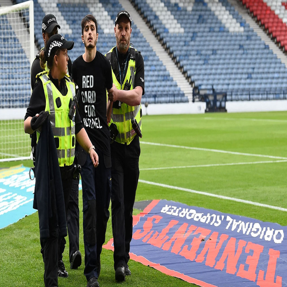 মাঠে ঢুকে কালো রঙের পোশাক পরা সেই প্রতিবাদকারী গোলপোস্টের সঙ্গে নিজেকে তালা মেরে আটকে রেখেছিলেন। তার টি-শার্টে একটি বার্তা লেখা ছিল, ‘ইসরায়েলকে লাল কার্ড’। এই প্রতিবাদকারী মাঠে ঢোকার আগে ‘হাই-ভিস ভেস্ট’ পরে ছিলেন, যে কারণে অনেকে তাকে মাঠের স্টুয়ার্ড ভেবে ভুল করেন। পুলিশ এবং স্টেডিয়ামের অন্য স্টাফরা মিলে সেই প্রতিবাদকারীকে গোলপোস্ট থেকে বিচ্ছিন্ন করেন।