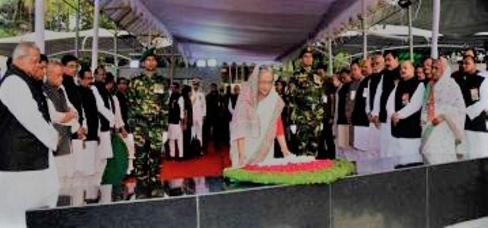 পুষ্পার্ঘ্য প্রদানের পর প্রধানমন্ত্রী বঙ্গবন্ধুর প্রতিকৃতির সামনে কিছুক্ষণ নীরবে দাঁড়িয়ে থাকেন।