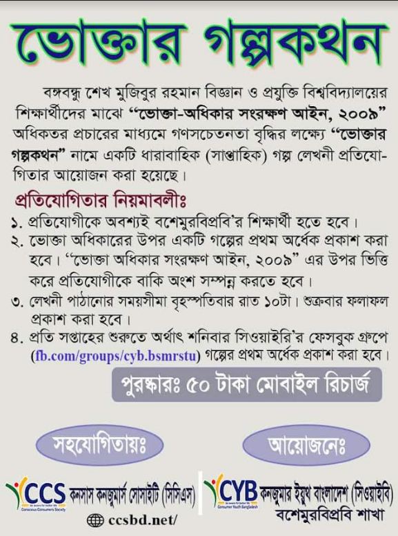 গোপালগঞ্জের বঙ্গবন্ধু শেখ মুজিবুর রহমান বিজ্ঞান ও প্রযুক্তি বিশ্ববিদ্যালয়ের (বশেমুরবিপ্রবি) শিক্ষার্থীদের মাঝে ভোক্তা অধিকার সংরক্ষণ আইন ও ভোক্তাদের অধিকার প্রচারের মাধ্যমে জনসচেতনতা বৃদ্ধির লক্ষ্যে "ভোক্তার গল্পকথন" শীর্ষক একটি অনলাইন গল্প প্রতিযোগিতা আয়োজন করেছে কনজুমার ইয়ুথ বাংলাদেশ (সিওয়াইবি), বশেমুরবিপ্রবি শাখা।