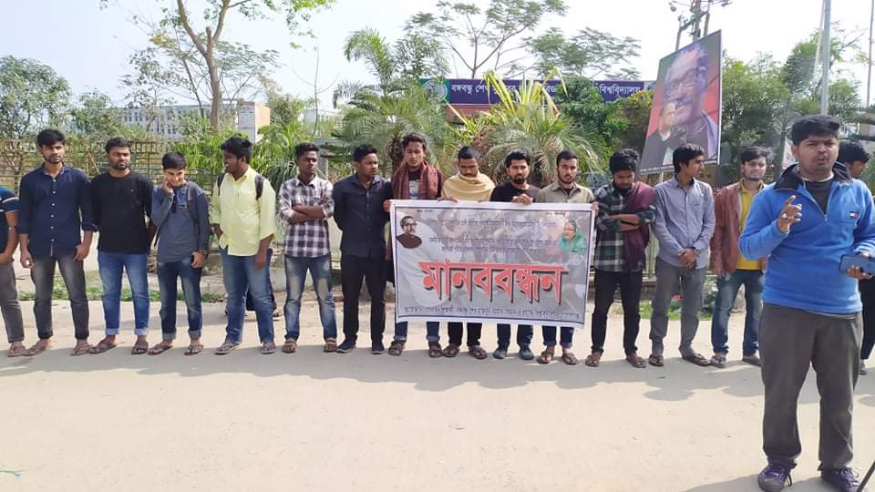ভারতের রাজধানী নয়াদিল্লিতে সংশোধিত নাগরিকত্ব আইনকে কেন্দ্র করে চলমান সাম্প্রদায়িক সহিংসতার প্রতিবাদে মানববন্ধন করেছে গোপালগঞ্জের বঙ্গবন্ধু শেখ মুজিবুর রহমান বিজ্ঞান ও প্রযুক্তি বিশ্ববিদ্যালয়ের সাধারণ শিক্ষার্থীরা।
