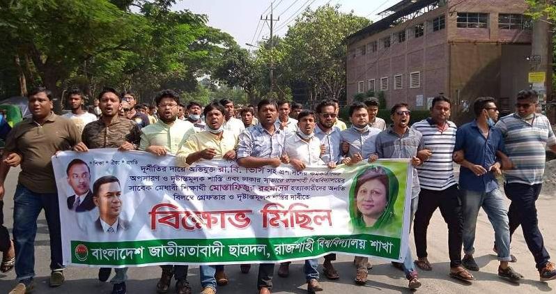 ইউজিসির তদন্তে রাজশাহী বিশ্ববিদ্যালয়ের (রাবি) ভিসি অধ্যাপক এম আব্দুস সোবহানসহ প্রশাসনের কর্মকর্তাদের বিরুদ্ধে দুর্নীতির অভিযোগ প্রমাণিত হওয়ায় তাদের অপসারণ দাবিতে বিক্ষোভ মিছিল করেছে বিশ্ববিদ্যালয় শাখা ছাত্রদল।