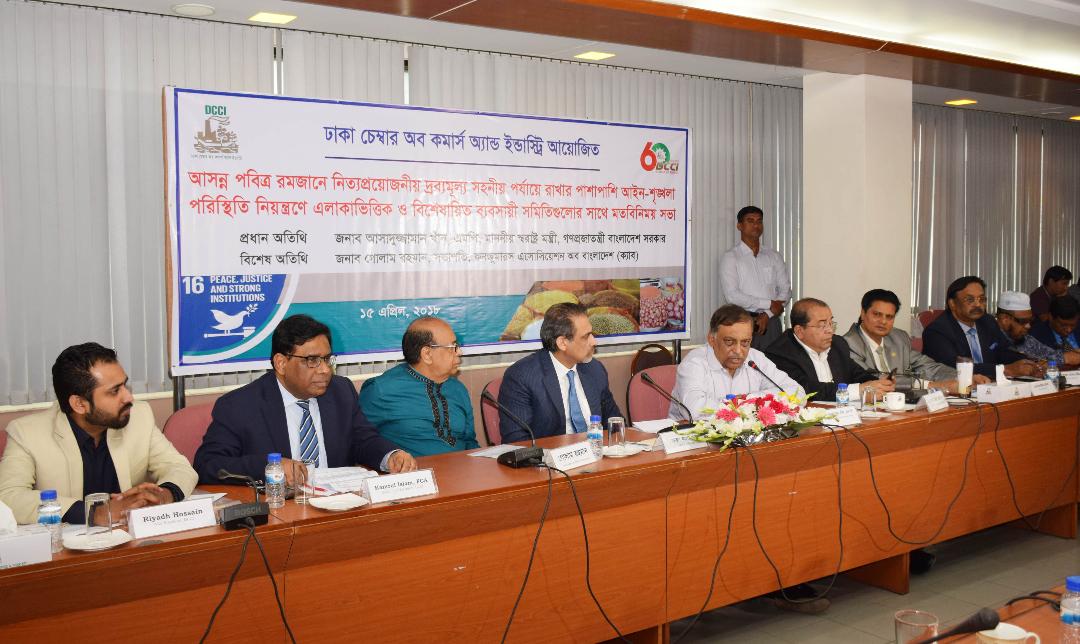 রোববার ডিসিসিআই আয়োজিত এক মতবিনিময় সভায় ব্যবসায়ীদের পক্ষ থেকে এ দাবি জানানো হয়। আসন্ন রমজান মাসে নিত্যপ্রয়োজনীয় দ্রব্যমূল্য সহনীয় পর্যায়ে রাখা এবং আইনশৃঙ্খলা পরিস্থিতি নিয়ন্ত্রণের বিষয়ে এলাকাভিত্তিক ও বিশেষায়িত ব্যবসায়ী সমিতিগুলোর প্রতিনিধিদের নিয়ে ডিসিসিআই মিলনায়তনে এ সভা অনুষ্ঠিত হয়। ডিসিসিআই সভাপতি আবুল কাসেম খানের সভাপতিত্বে অনুষ্ঠিত সভায় প্রধান অতিথি ছিলেন স্বরাষ্ট্রমন্ত্রী আসাদুজ্জামান খান কামাল। এতে বিশেষ অতিথি ছিলেন কনজ্যুমার্স অ্যাসোসিয়েশন অব বাংলাদেশের (ক্যাব) সভাপতি গোলাম রহমান। মূল প্রবন্ধ উপস্থাপন করেন ঢাকা বিশ্ববিদ্যালয়ের অপরাধতত্ত্ব বিভাগের অধ্যাপক ও চেয়ারম্যান জিয়া রহমান।