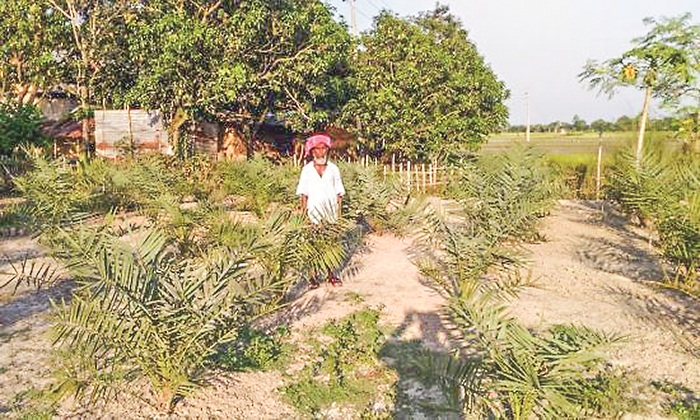 ফলকে লেখা রয়েছে- ‘বরেন্দ্র ভূমিতে সৌদির খেজুর বাগান ও নার্সারি।’ বাড়ির পাশেই লাগোয়া জমিতে ছেলে ওবাইদুল ইসলাম রুবেলকে নিয়ে গড়ে তুলেছেন সৌদির খেজুর বাগান।